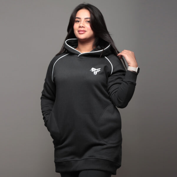 Designed with a long silhouette and a cozy hood, it offers a relaxed fit that’s perfect for casual outings or active days. The pullover style features a kangaroo pocket for added convenience and warmth, while the finished hem and cuffs with topstitching give it a polished, sporty look.